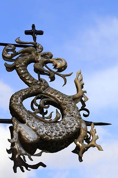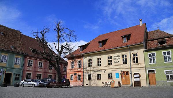 城市的房舍色彩繽紛,在藍天下有一股活剝的氣氛,但或許是淡季,街道上的人潮還是冷冷清清的,不免俗的,我還是先散步到了弗拉德的出生地,一幢位在轉角的黃色三層樓房舍,現在是一家名為Casa Vlad-Dracul的餐廳,門口不忘掛上龍的標誌,那是德古拉的象徵之一,「德古」(Dracul)在羅馬尼亞文中是「龍」的意思,而隸屬於龍騎士團的弗拉德二世因此有了「德古」的稱號,其子,弗拉德三世,則有了我們熟悉的吸血鬼代名詞「德古拉」(Dracula)的名號,也就是所謂的「龍之子」。